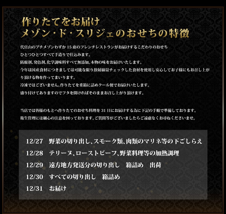 サイトの表示上最短のお届け日が表示されますが、おせち料理はすべて12/31午前中着にて発送いたします。